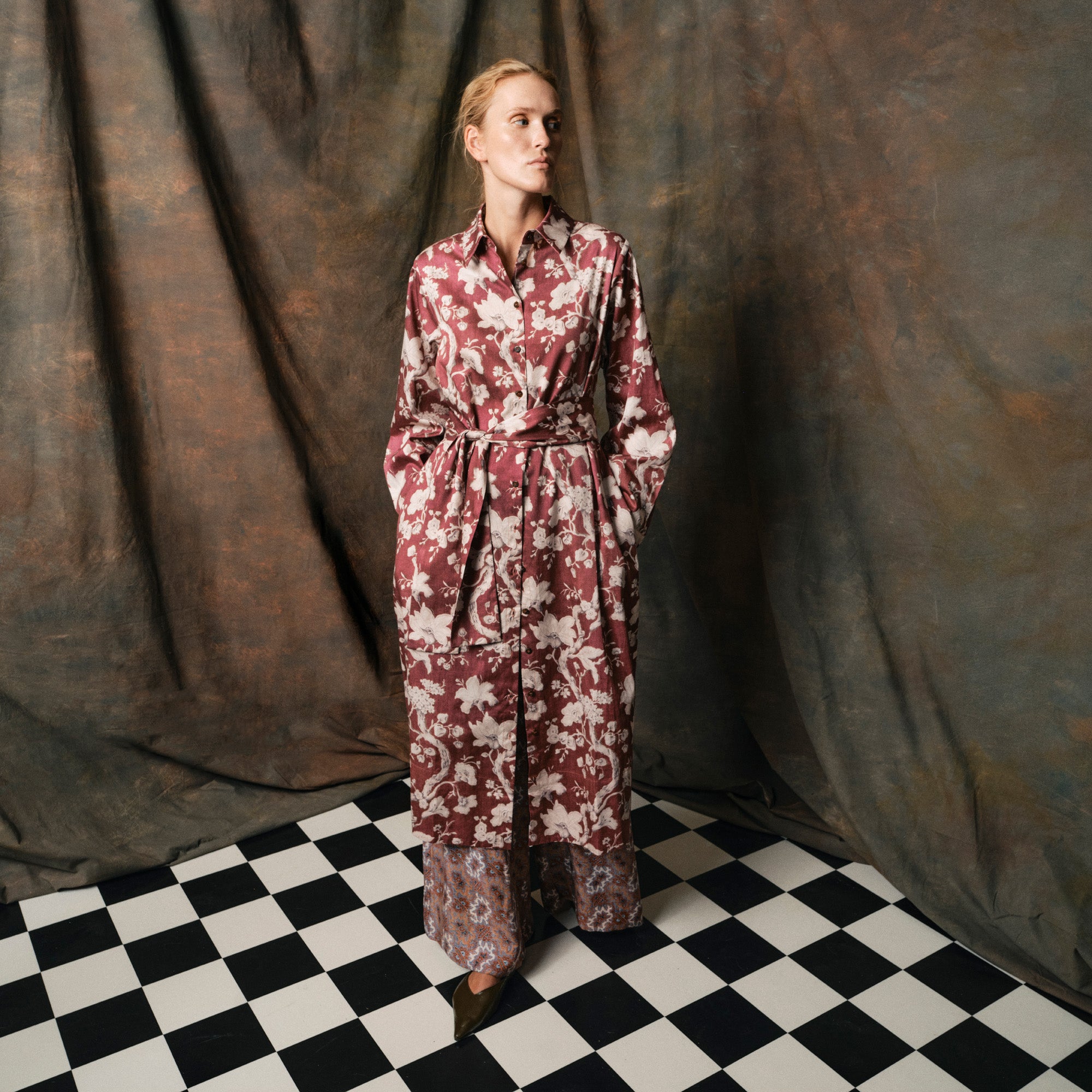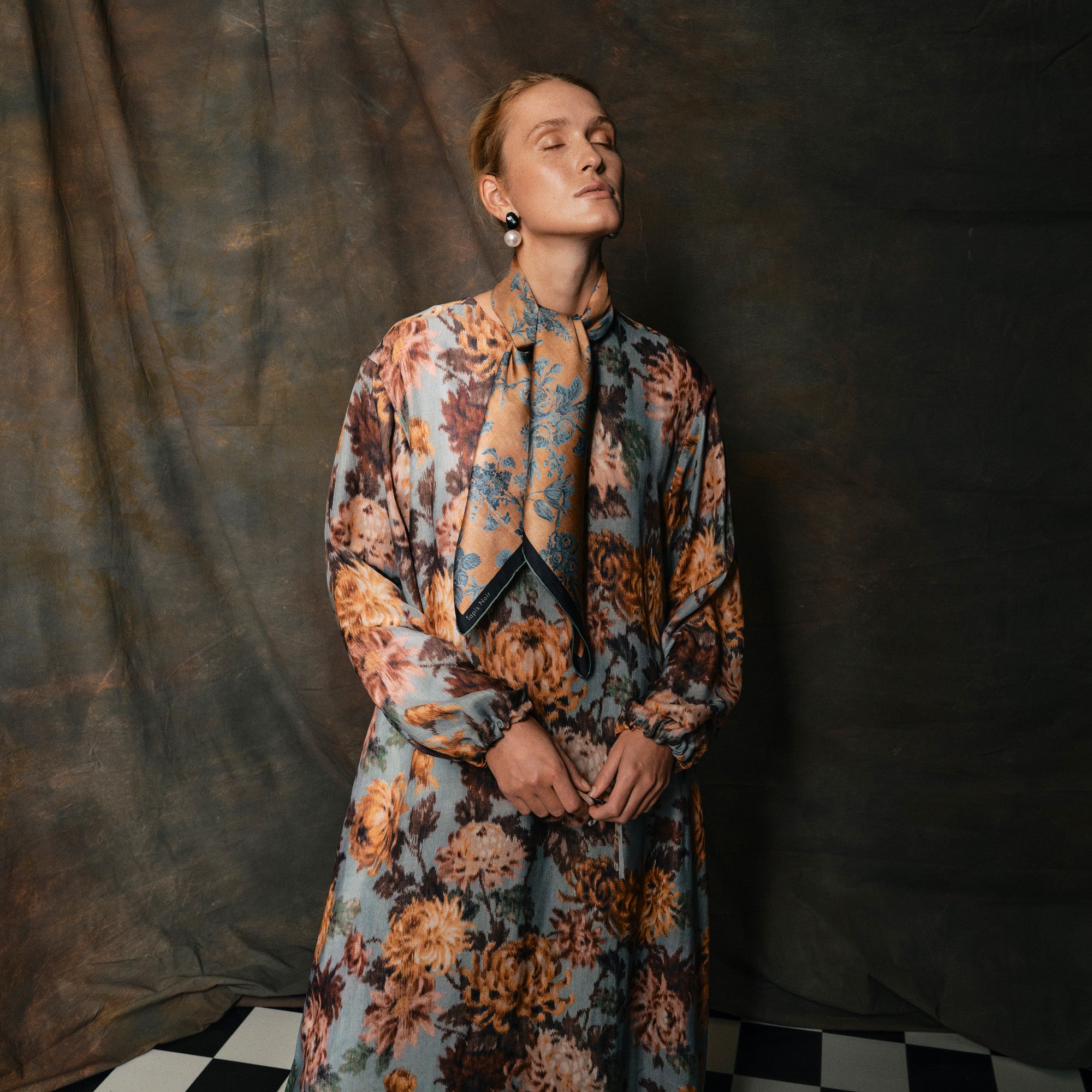 Der er to forskellige print på tørklædet. Det ene er et fransk "toile-de-jouy" i beige og blåt.